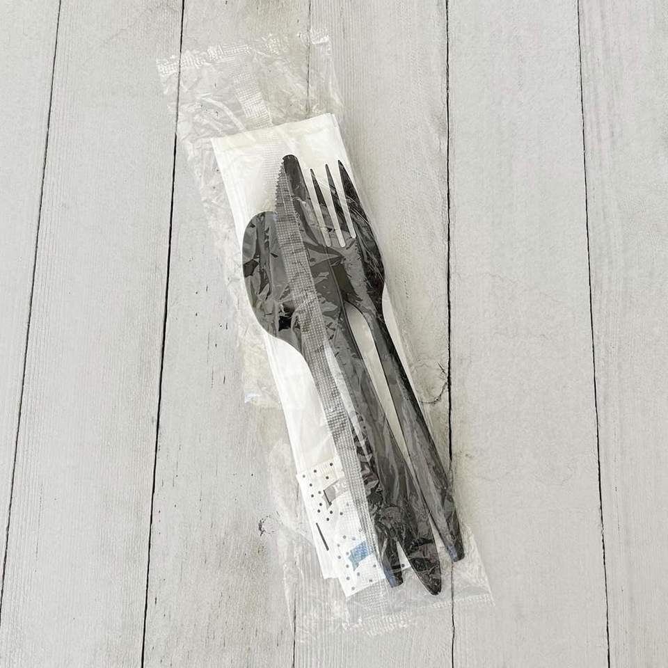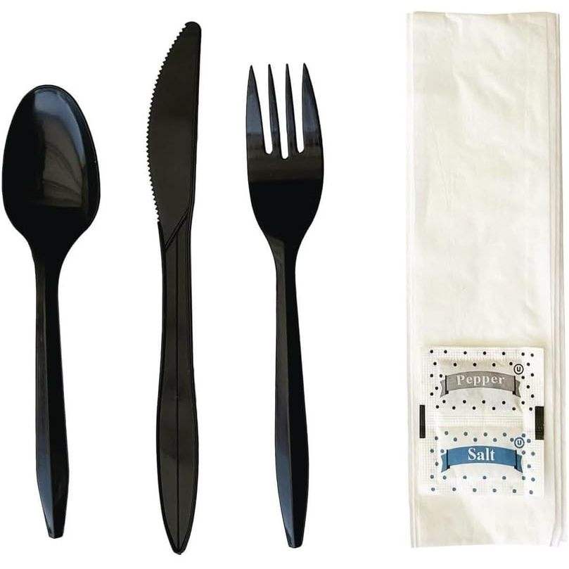 Six-Piece Mediumweight Cutlery Kit 5.86\" PS Black Fork/Knife/Napkin/Pepper/Salt/Spoon Customizable for Parties 250/Carton