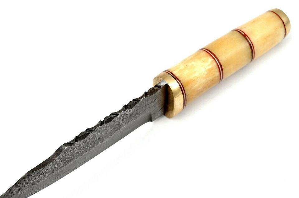 Sizzco Handmade Damascus Steel Fixed Blade Skinner Knife with Camel Bone Handle Brass Clip for Hunting Camping OEM Utility Knife
