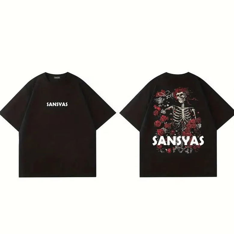 Skeleton Rose Graphic Oversized Black TShirt Men Streetwear Fashion Casual Summer Tee Soft Cotton Short Sleeve Hip Hop Style Top