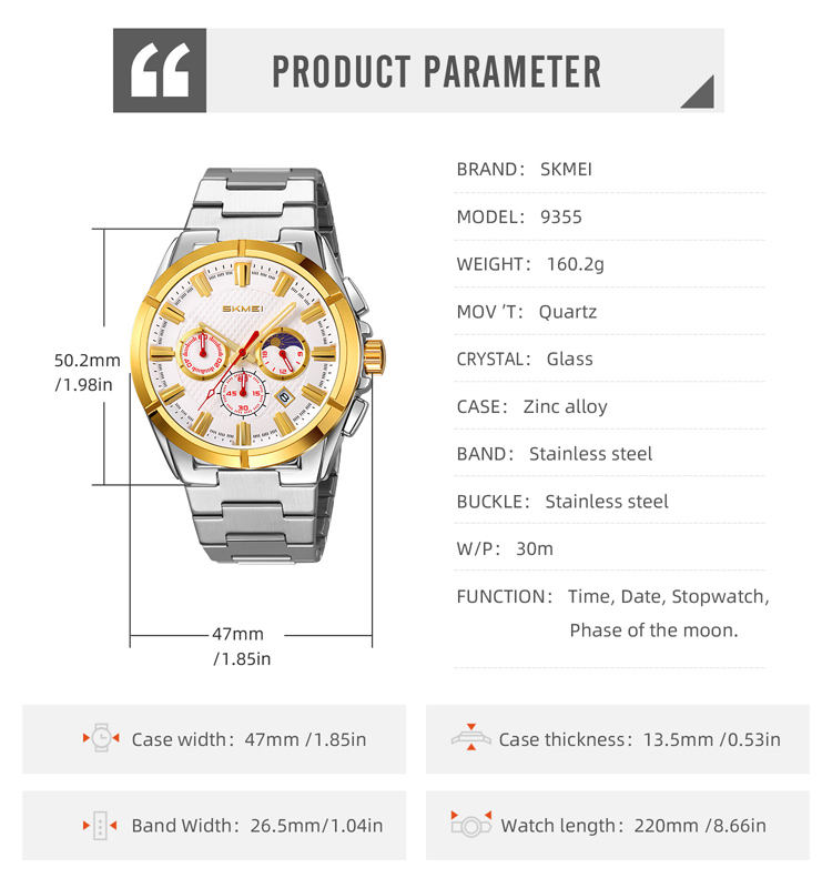 Skmei 9355 Luxury Quartz Watch round Gold Stainless Steel Band Waterproof Wristwatch Glass Dial Buckle Clasp Wholesale