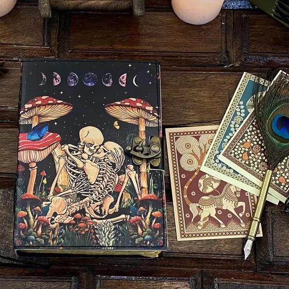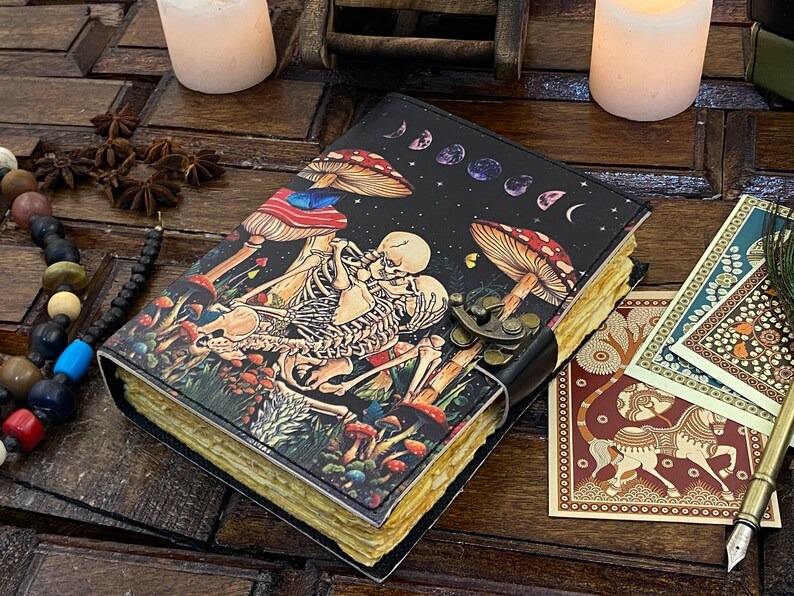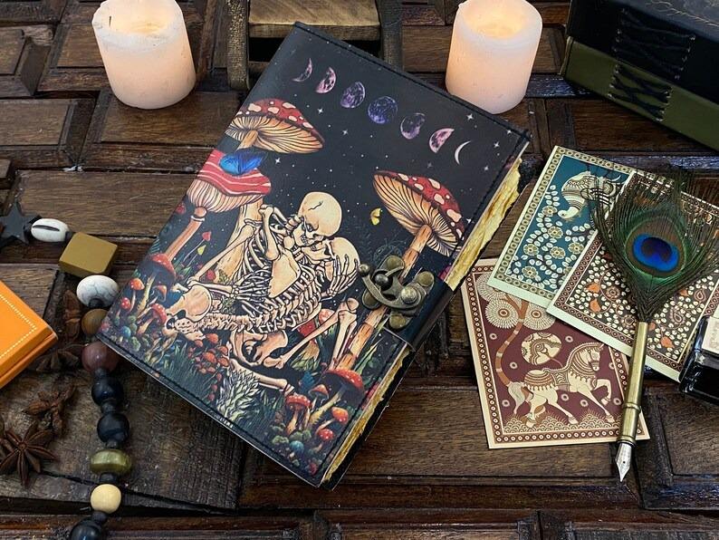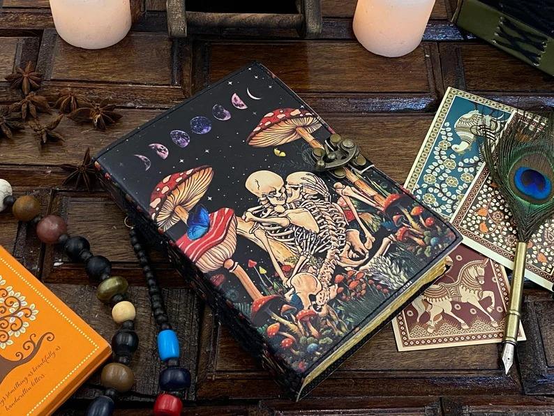 Skull Lovers Grimoire Leather bound journal Blank spell book of shadows Witch wiccan Journal book of lovers gift for Halloween