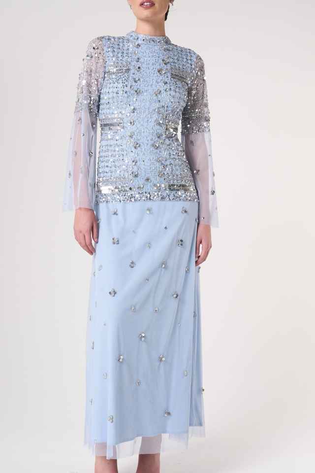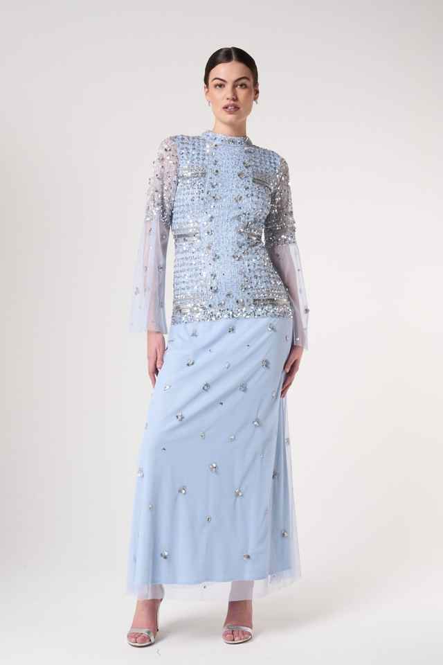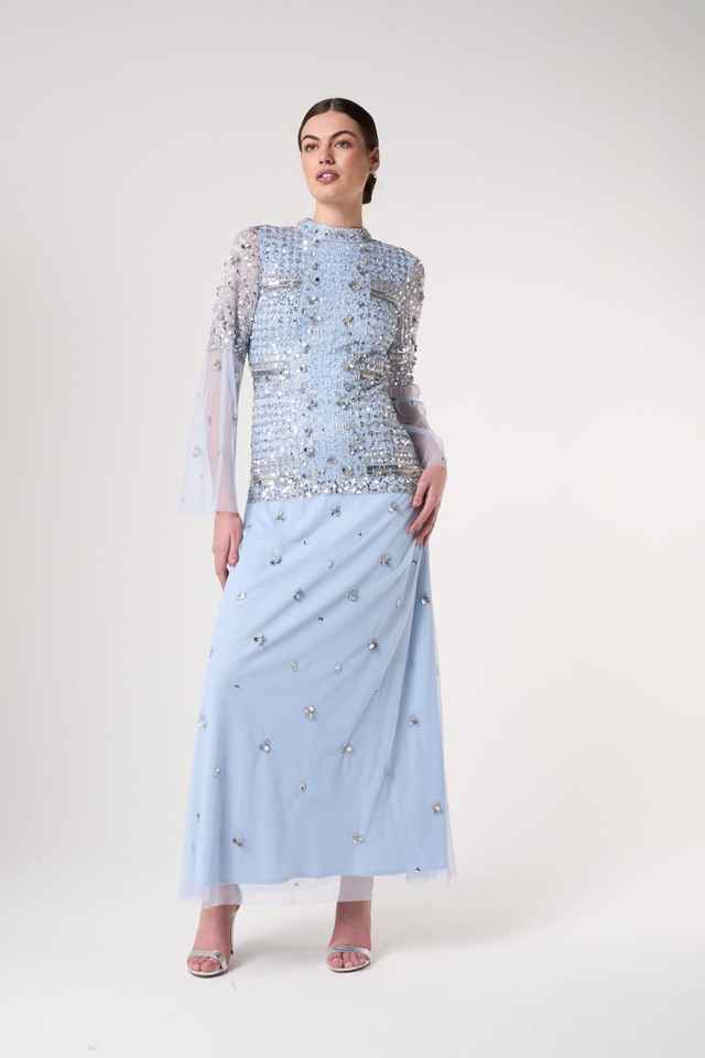 Sky Blue Evening Gown with Full Sleeves Maxi-Length and O-Neck Hand Embroidered Plus Size Formal Wear Anti-Static Dress