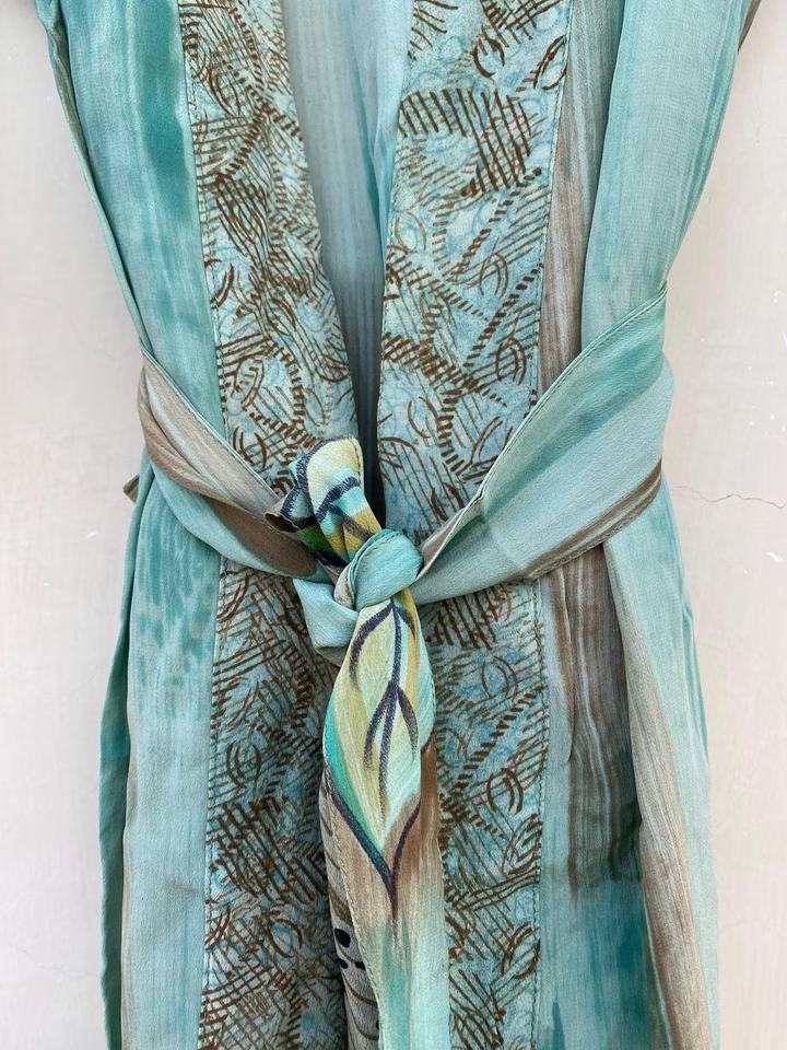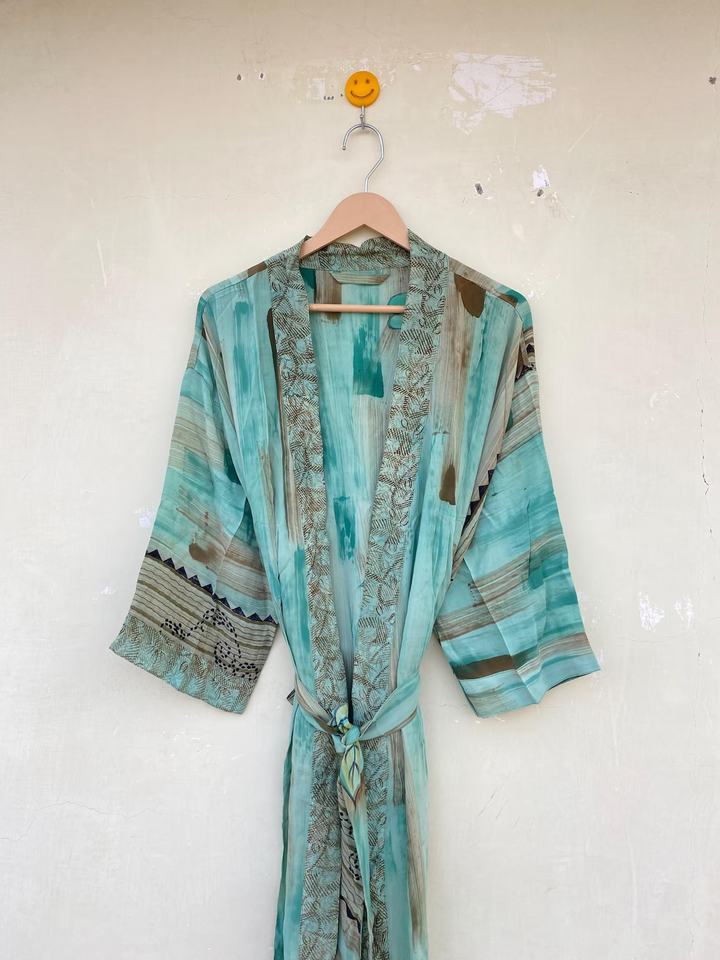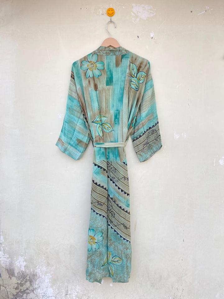 Sky Blue Indian Silk Vintage Handmade Recycled Silk Sari Kimono for Her Floral Cardigan Robe for Women