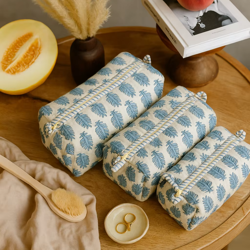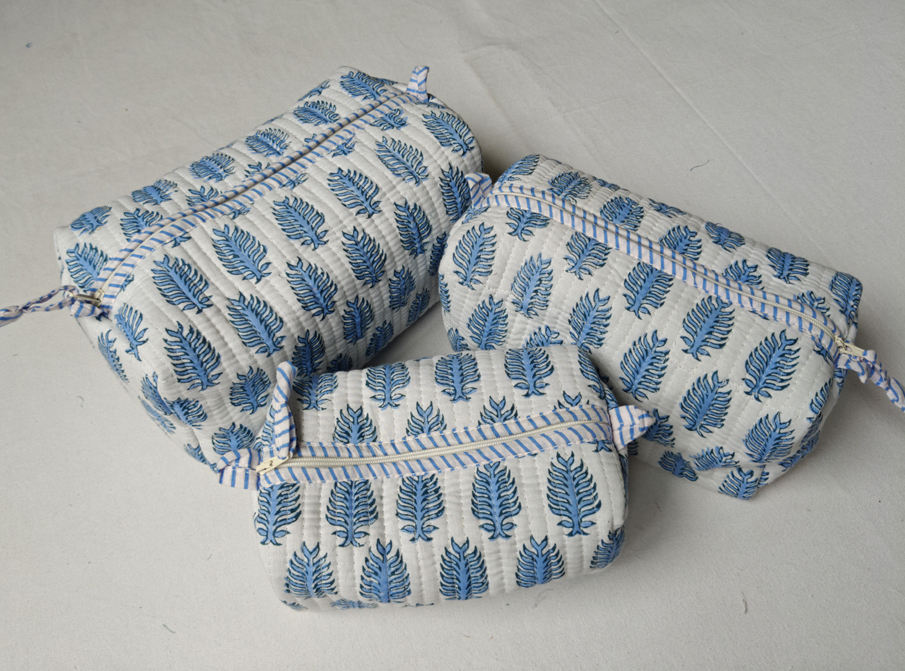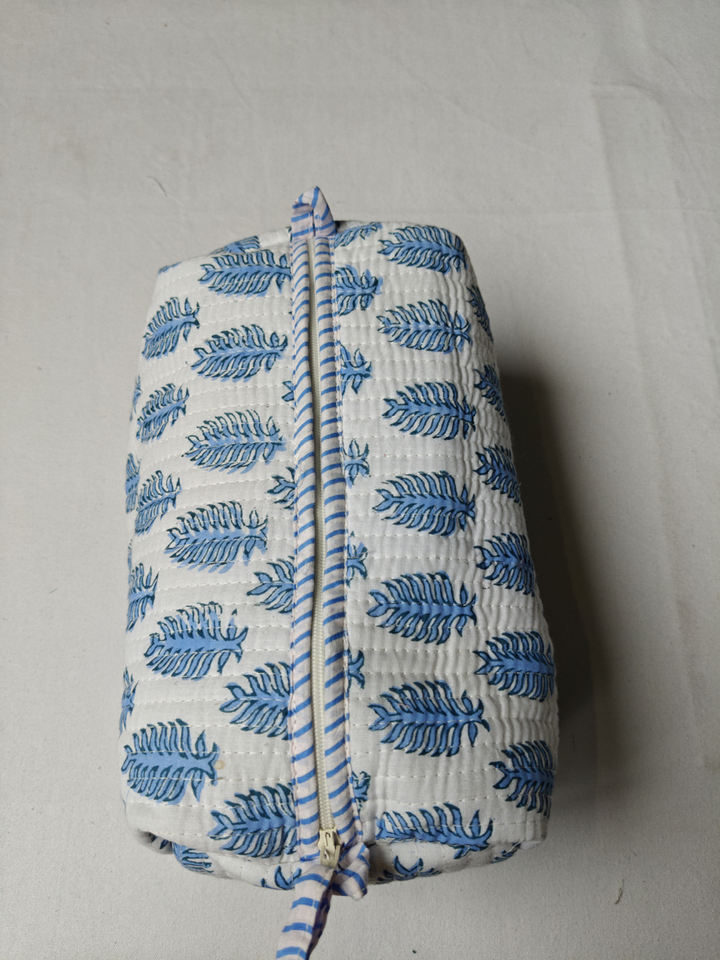 Sky Blue Leaf Quilted Cotton Travel Makeup Square Style Organizer Large Capacity Indian Pouch Leaf Block Print Zipper Case