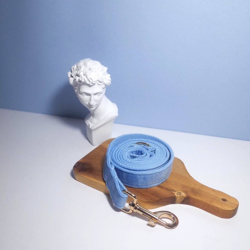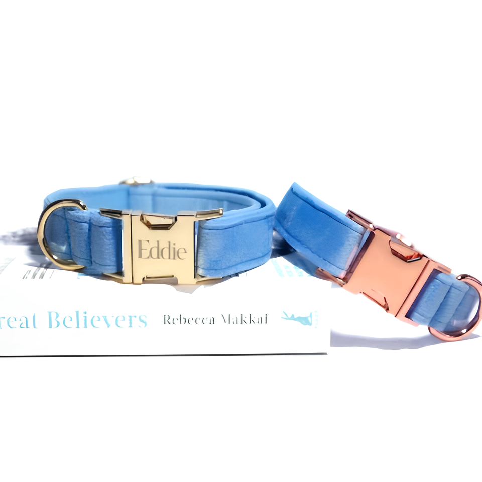 Sky Blue Personalized Leather Handmade Thick Boy Puppy and Leash Wedding Dog Collar Gold Custom Engraved Nameplate
