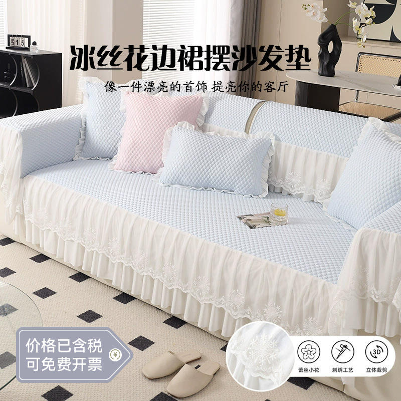 SkyCool Summer Ice Silk Sofa Cushion Quilted Solid Color Machine Washable Pad Type Sofa Cover With Lace Skirt Hem