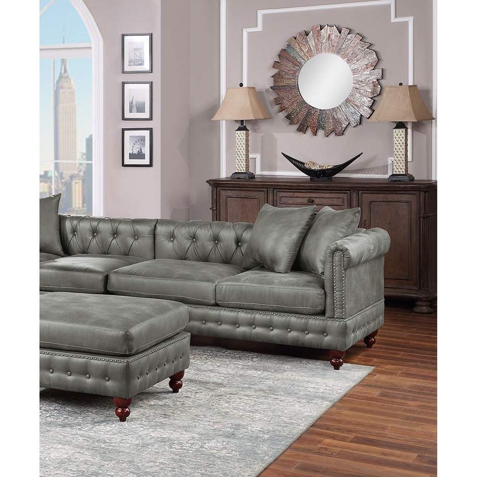 Slate Grey Breathable Leatherette 4pc Sectional Set 3x Reversible Loveseat/Chaise 1x Ottoman Tufted Couch Pillows Living Room