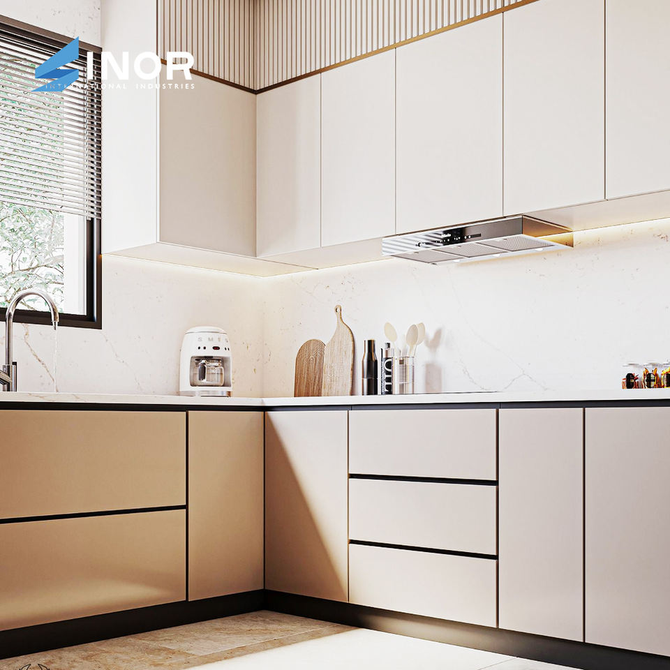Sleek Custom Kitchen Cabinets Gray Handleless Push to Open Drawers Shelves Waterproof Modern Homes