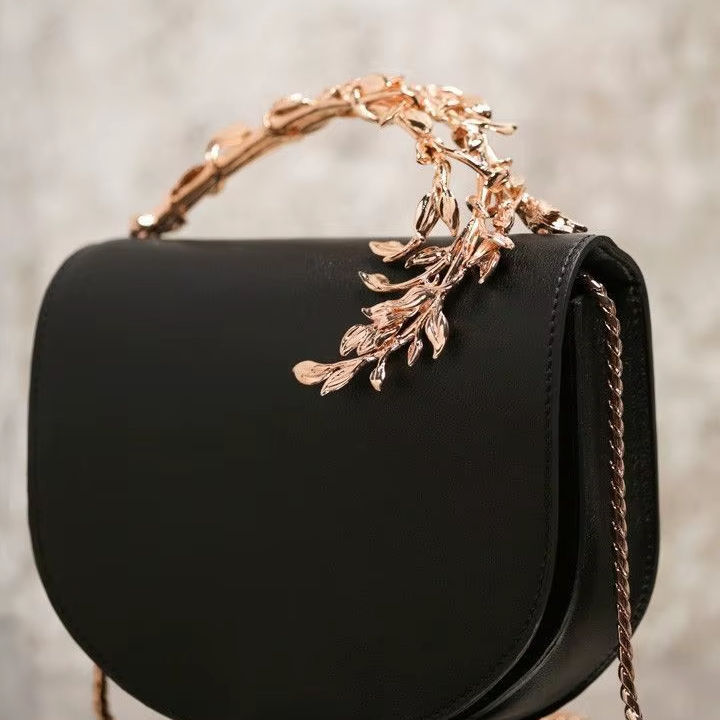 Sleek black saddle bag with a stunning gold leaf handle. Available at wholesale prices.