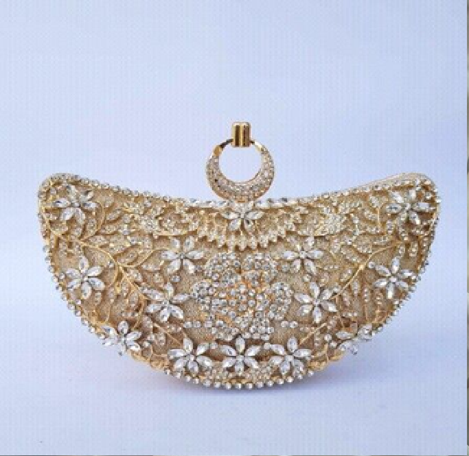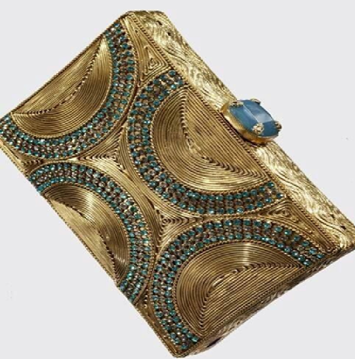 Sleek horizontal gold metal clutch with a central emerald stone and beaded chain. Bold, available at wholesale prices.