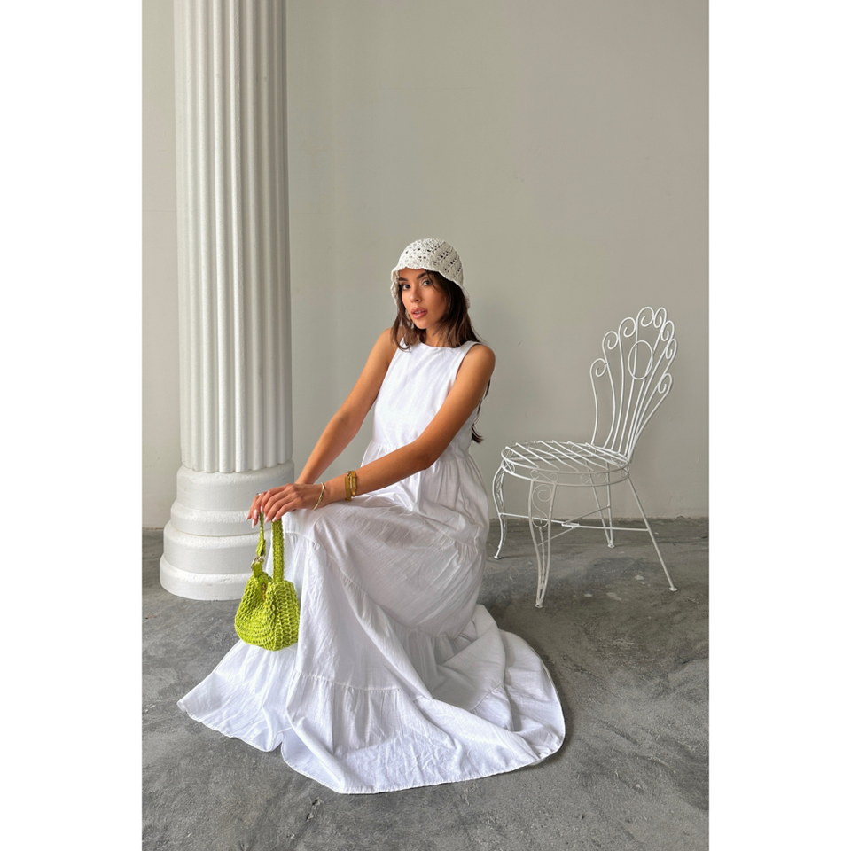 Sleeveless White Linen Wedding Dress with Long Flame Detail Elegant and Stylish