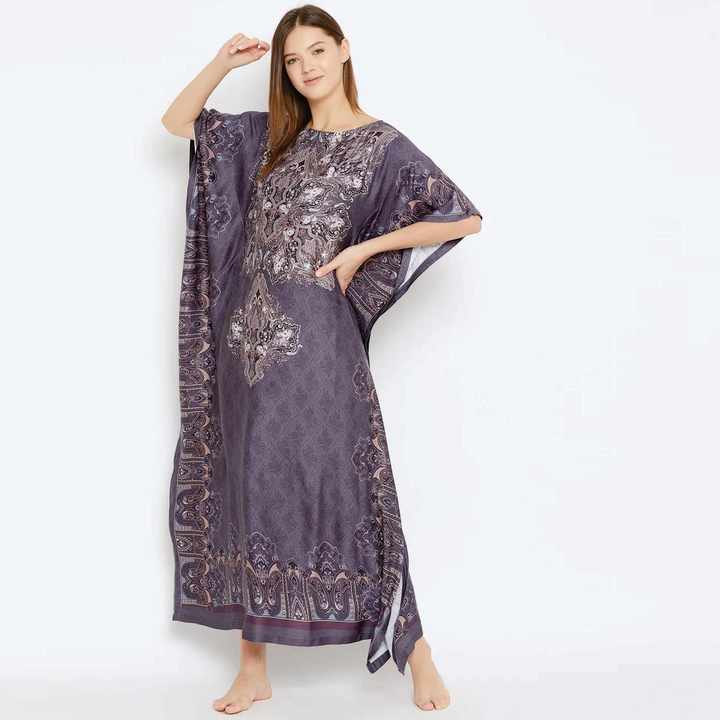 Slim Fit Boat Neck Short Extended Sleeves Viscose Rayon Regal Motif Printed Grey Maxi Kaftan