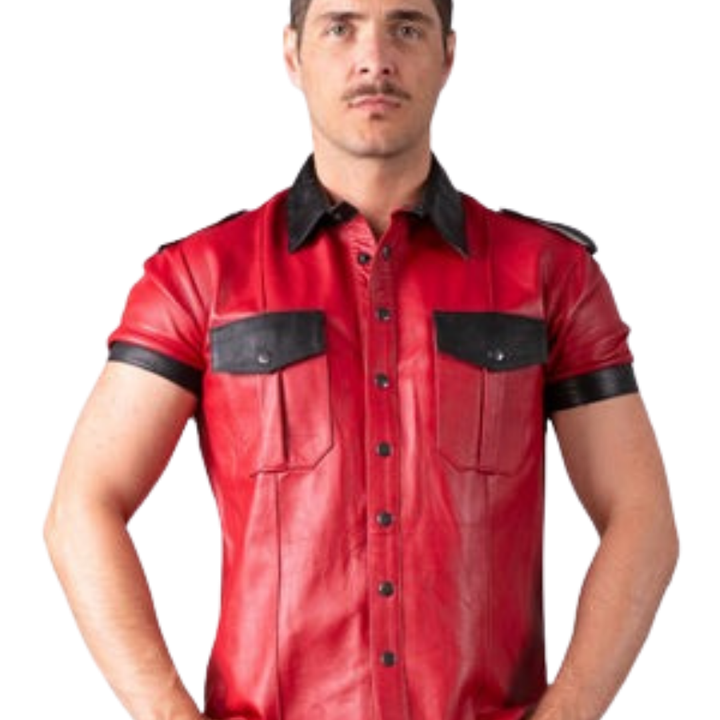Slim Fit Leather Shirt Red and Black Mens Faux Leather Short Sleeve Fetish Button Down Top
