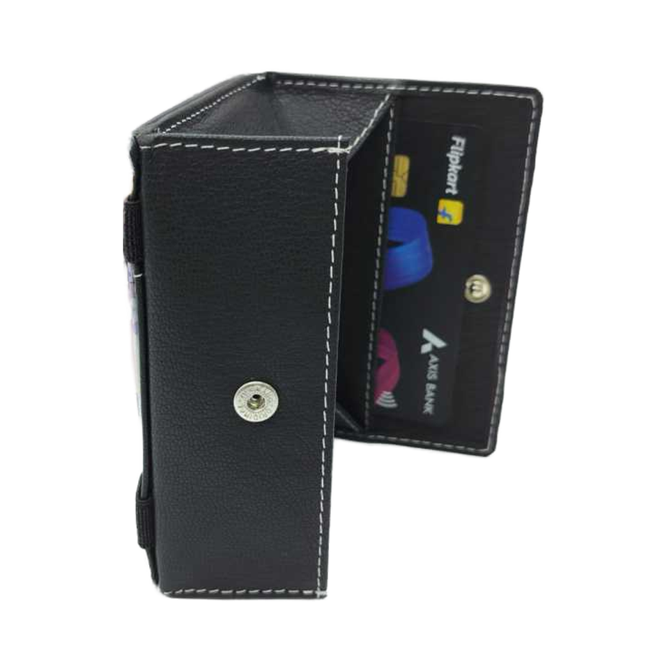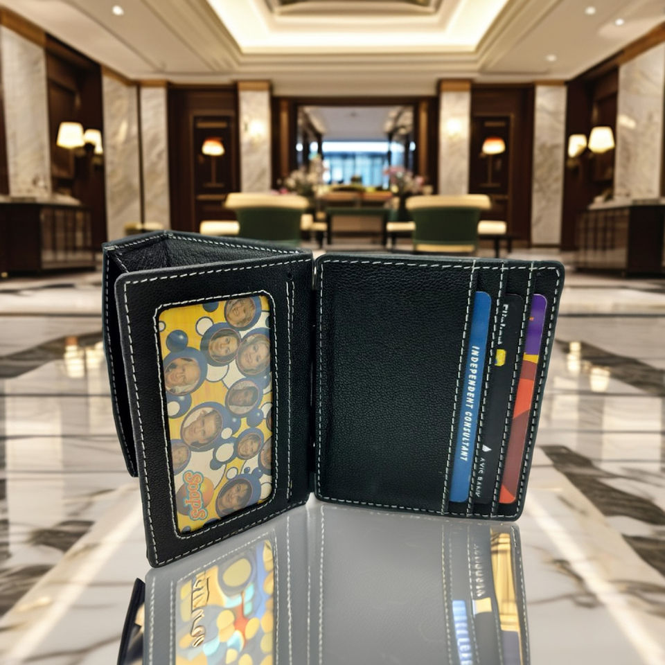 Slim black leather wallet card holder, minimalist, stylish, stitched, unisex, credit/debit card organizer, pockets, compact.