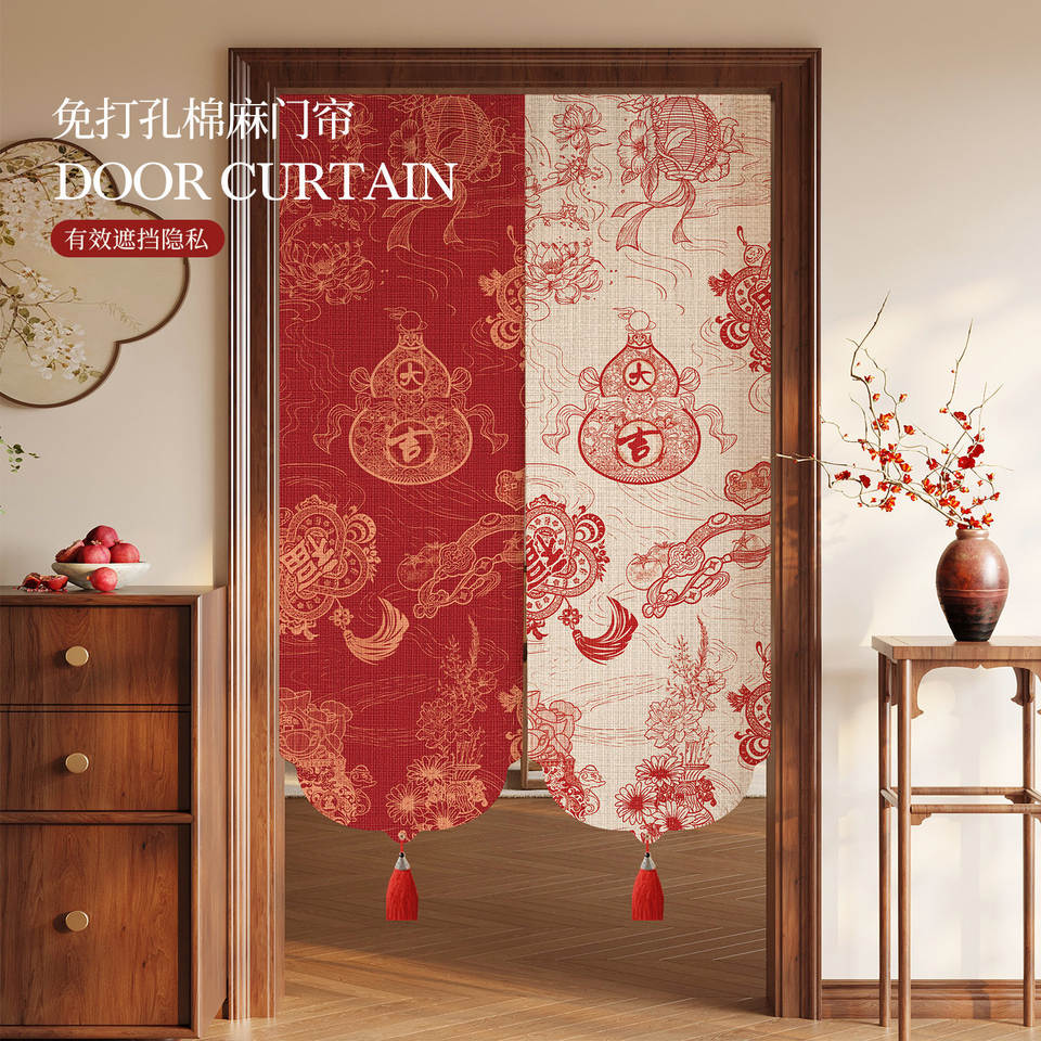 Slow Down Chinese Style Cotton Linen Door Curtain Red Festive Pattern Side Opening With Tassels For Interior Decor