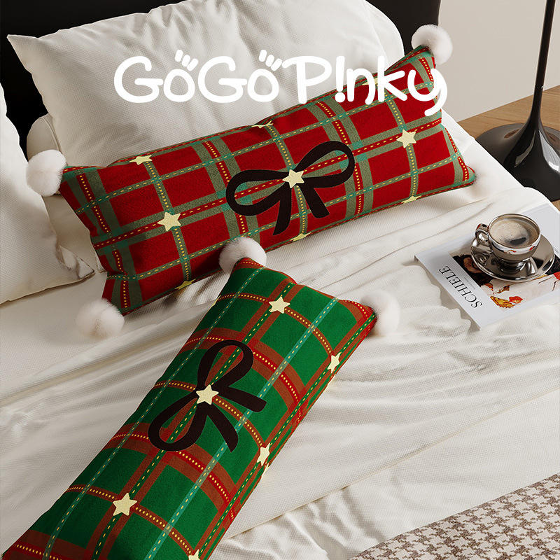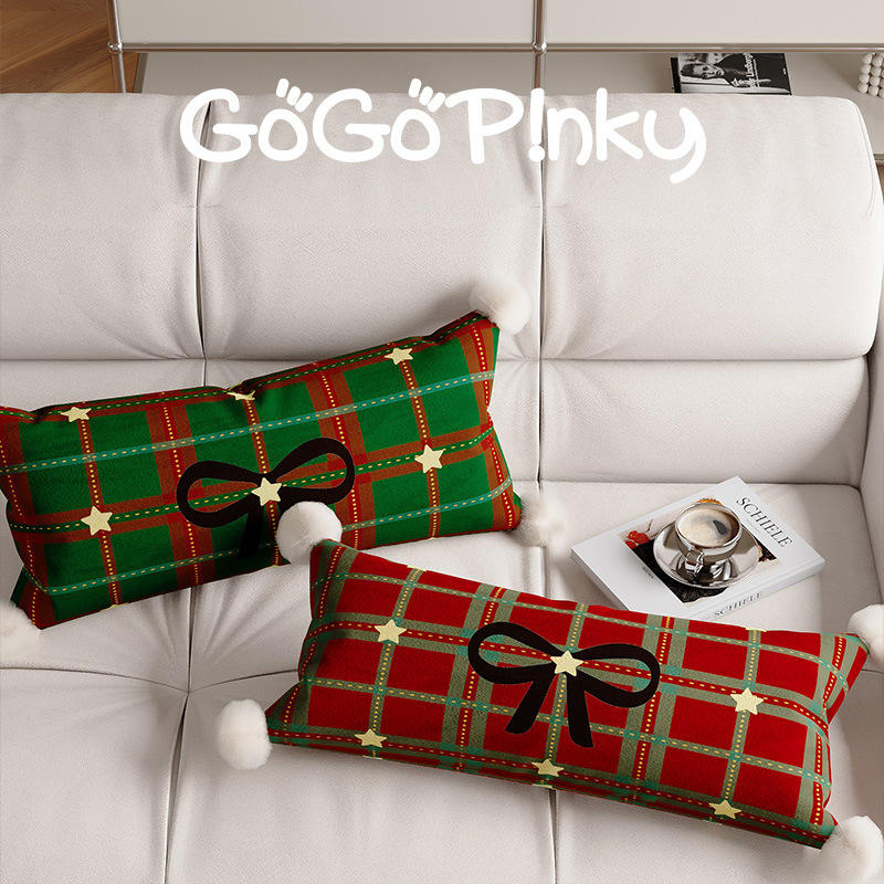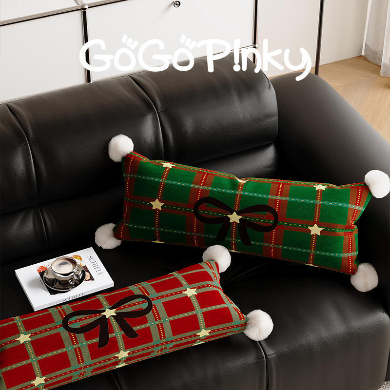Slow Down Christmas Plaid Lumbar Pillow Oblong With Pom Poms Washable For Sofa Car Bedroom Decor