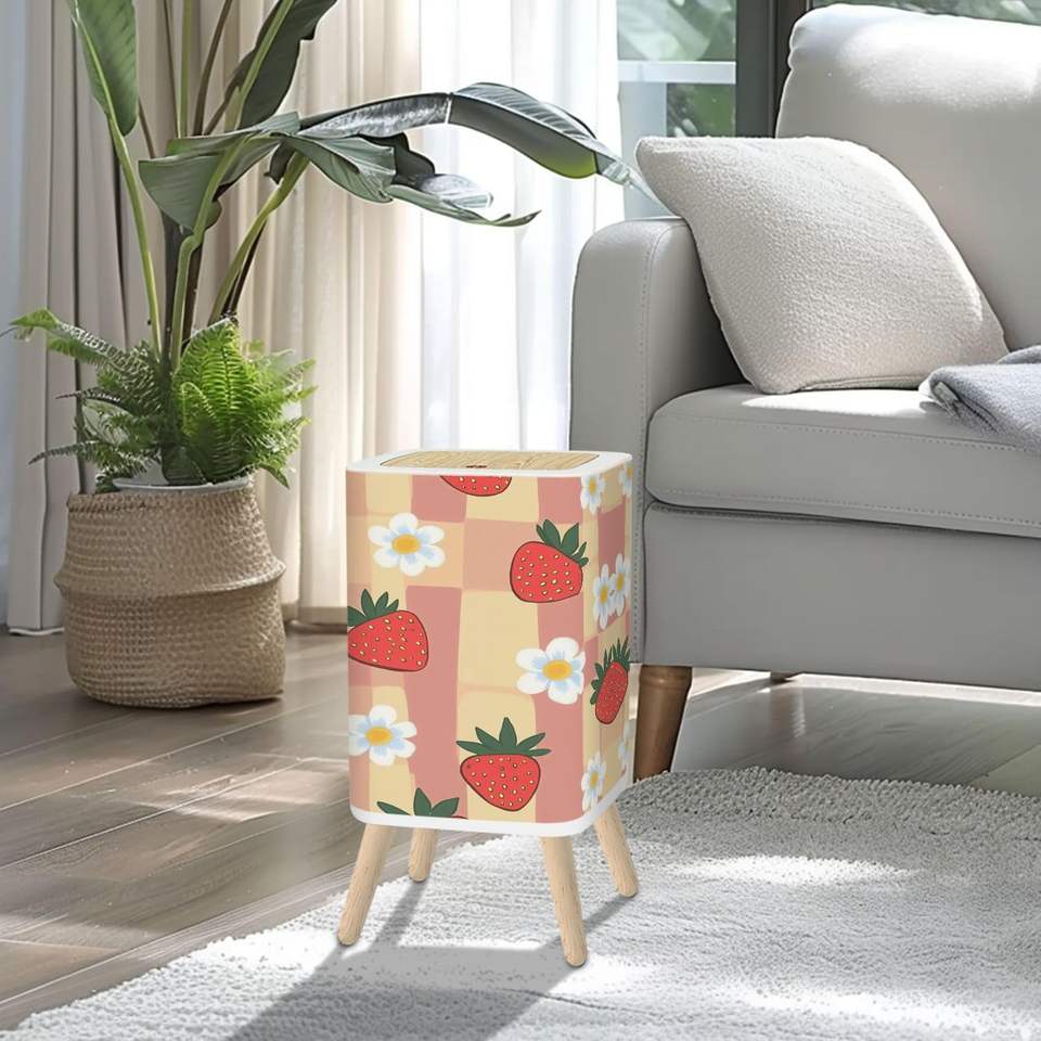 Small Square Trash Can with Lid 2.6Gal/10L Strawberry Gingham Tartan Pattern Floral Pop-Up Lid Wood Legs Waste Bin in Stock