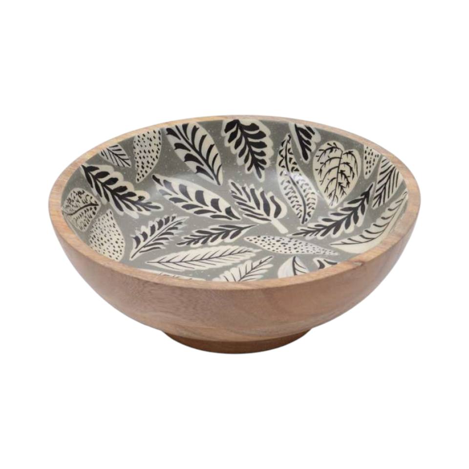 Small Wooden Bowl Set With Black Leaf Pattern Enamel Interior Designed For Daily Table Use