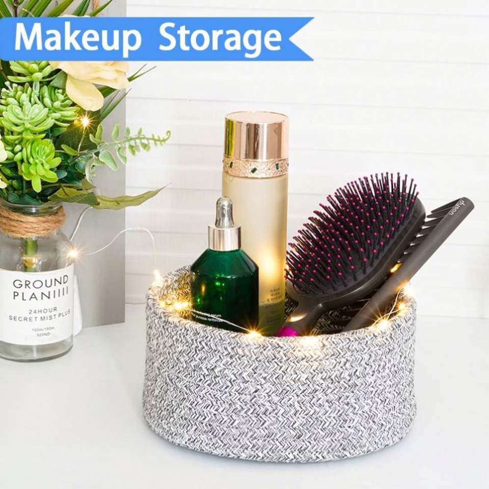 Small Woven Basket Cotton Woven Grey Basket for Gifts Mini Storage Tiny Decorative Boho Round Basket for Office Bathroom Bedroom