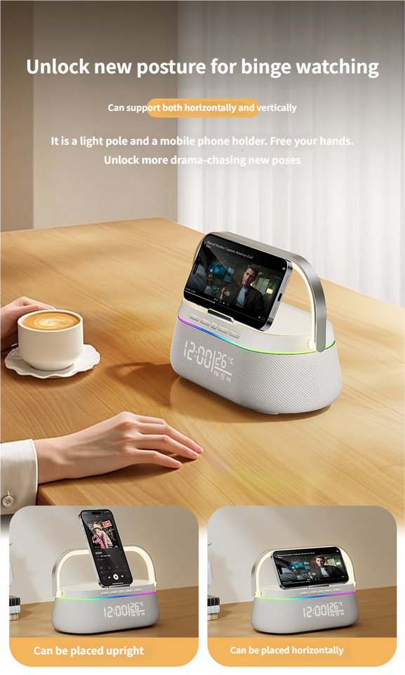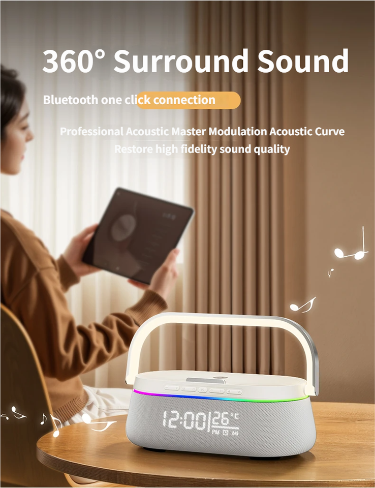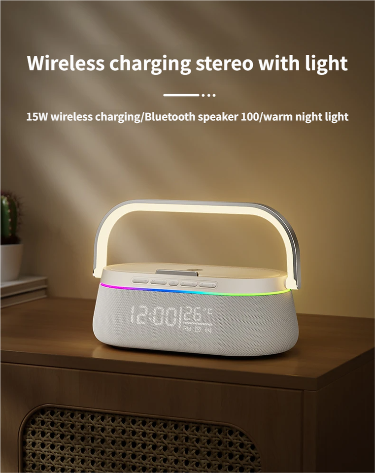 feature:colorful LED light, Clock, Alarm, Phone Function, Wireless Charger for Mobile Phone