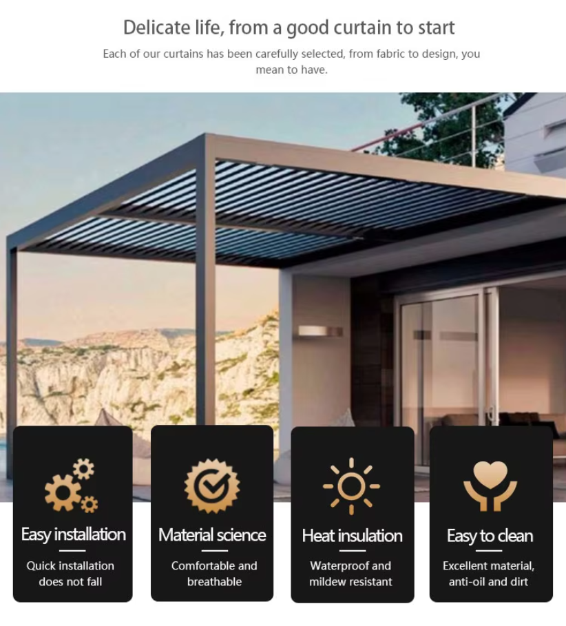 Backyard, Beach, Camping, Courtyard, Decorations, Garden, Gardening, Hotel, Motorized, Outdoor, Park, Party, Patio, Restaurant, Sunshade, Swimming Pool, Terrace, UV Protection, Villa, Waterproof, Wedding, Windproof, balcony, garden decorations, garden gazebo, garden pavilion, outdoor gardening, residential buildings, snowproofApplication