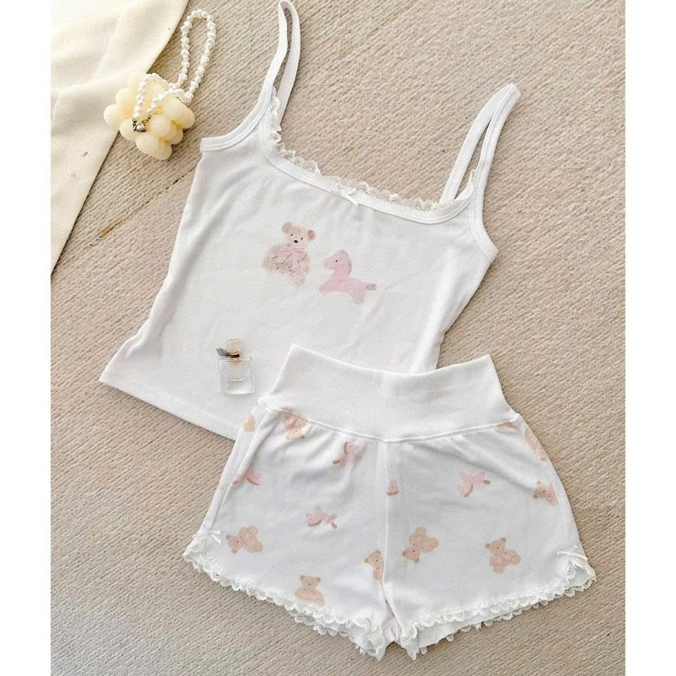 Soft Cotton Sleepwear Set Women Cute Bunny Print Lace Trim Cami Top and High Waist Shorts Pajama Set for Comfortable Nightwear