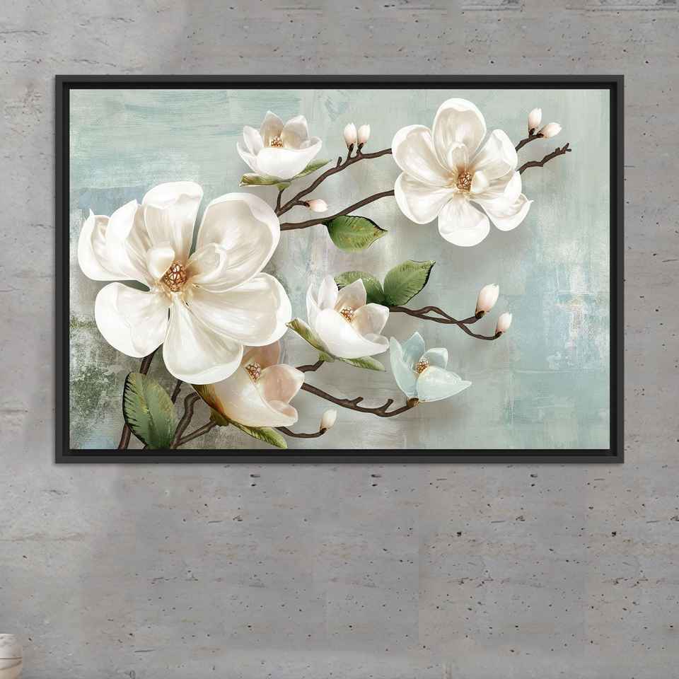 Soft Ivory Floral Wall Art: Printed Canvas for Elegant Decor,BLACK FRAMED CANVAS