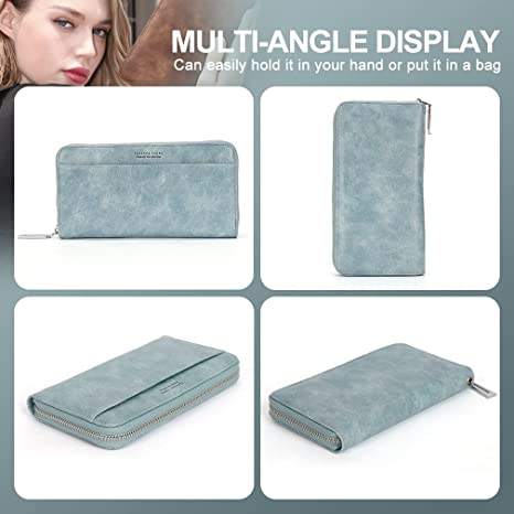 Soft PU Leather Long Zipper Clutch Wristlet Wallet Multi Credit Card Holder RFID Cute Organizer Cell Phone Purse Blue Women's