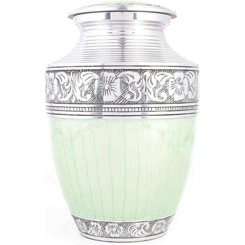 Soft Mint Green And Silver Engraved Cremation Urn With Floral Band Design For Elegant Memorial Use