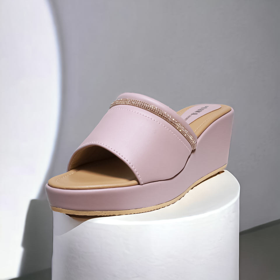 Soft PU Rexine Upper Adorned with Rhinestone Mesh Paired with Luxurious Soft Rubber Cork Wedge Sole for Effortless Style