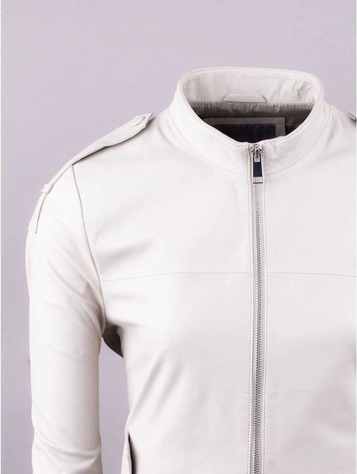 Soft Pure White Genuine Leather Women Jackets White Funnel Collar for Summer Full Zipper New Designer Slim Fit Biker Jacket