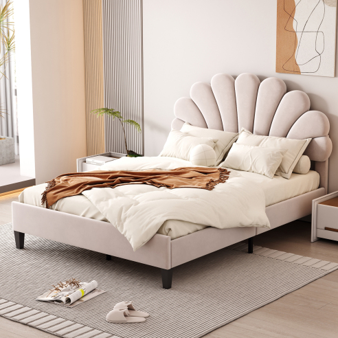 Soft Style Flower Pattern Velvet Upholstered Platform Bed with Storage Headboard Bedroom Furniture for Living Room