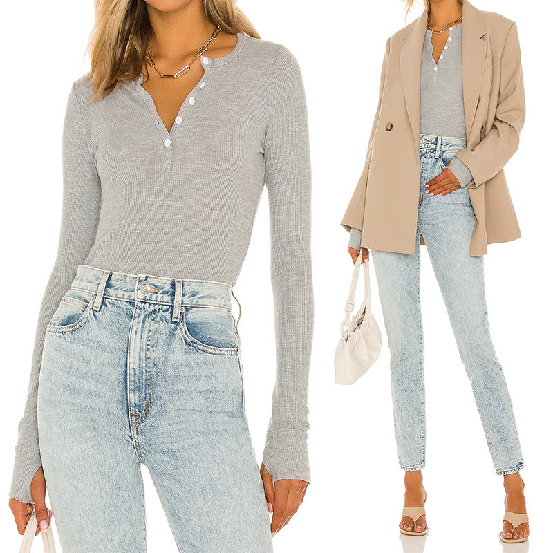 Soft Thermal Knit Women Top Long Sleeves Thumb Cut Outs Bodycon Grey Henley Tee