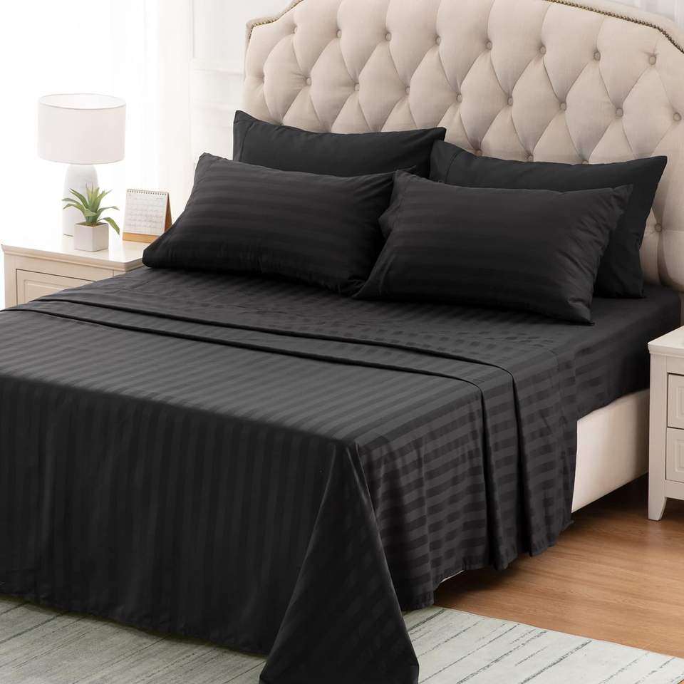 Soft and Durable Satin Pillowcase, Flat Sheet and Fitted Sheet 4 -PC Set Black Stripe
