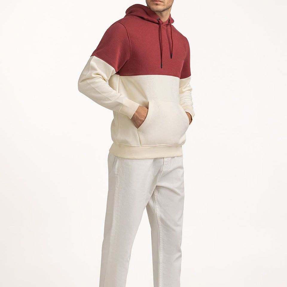 Soft two tone 100% cotton fleece hoodie with maroon top and cream lower body featuring drawstring hood and comfy fit for casual