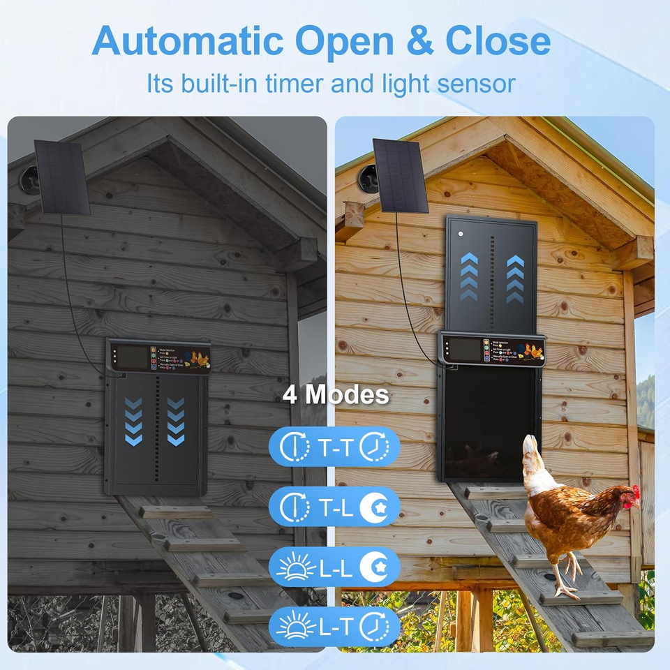Solar Auto Chicken Coop Door LCD Timer Light Sensor 20m Remote 4 Modes USB Rechargeable Black