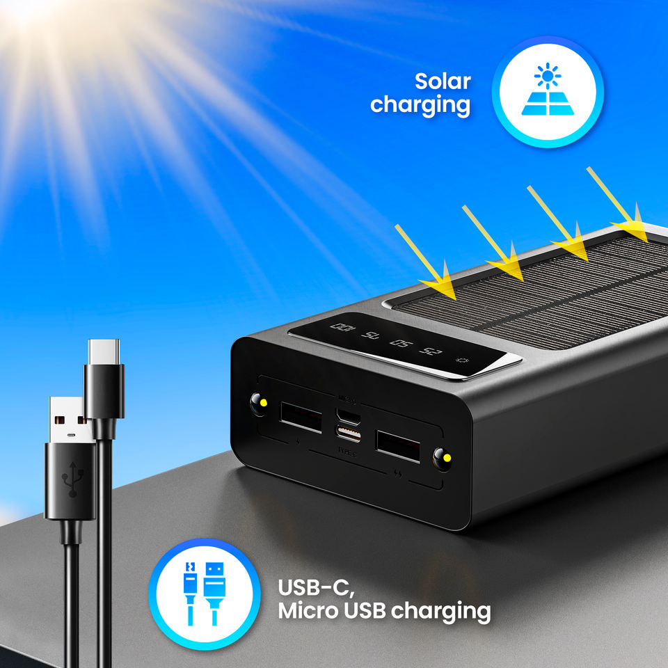 Solar Power Station 20000mAh Black Dual LED Flashlight Waterproof Portable Compact Micro USB Solar Charging 10W