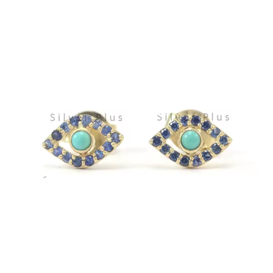 Solid 14k Yellow Gold Turquoise Blue Sapphire Gemstone Eye Stud Earrings Trendy Handmade Jewelry for Weddings Parties Bulk Order