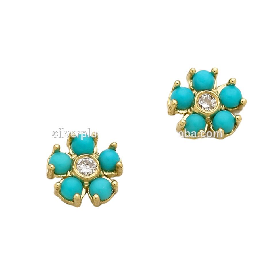 Solid 18k Yellow Gold Diamond Turquoise Stud Earrings Wholesale Jewelry