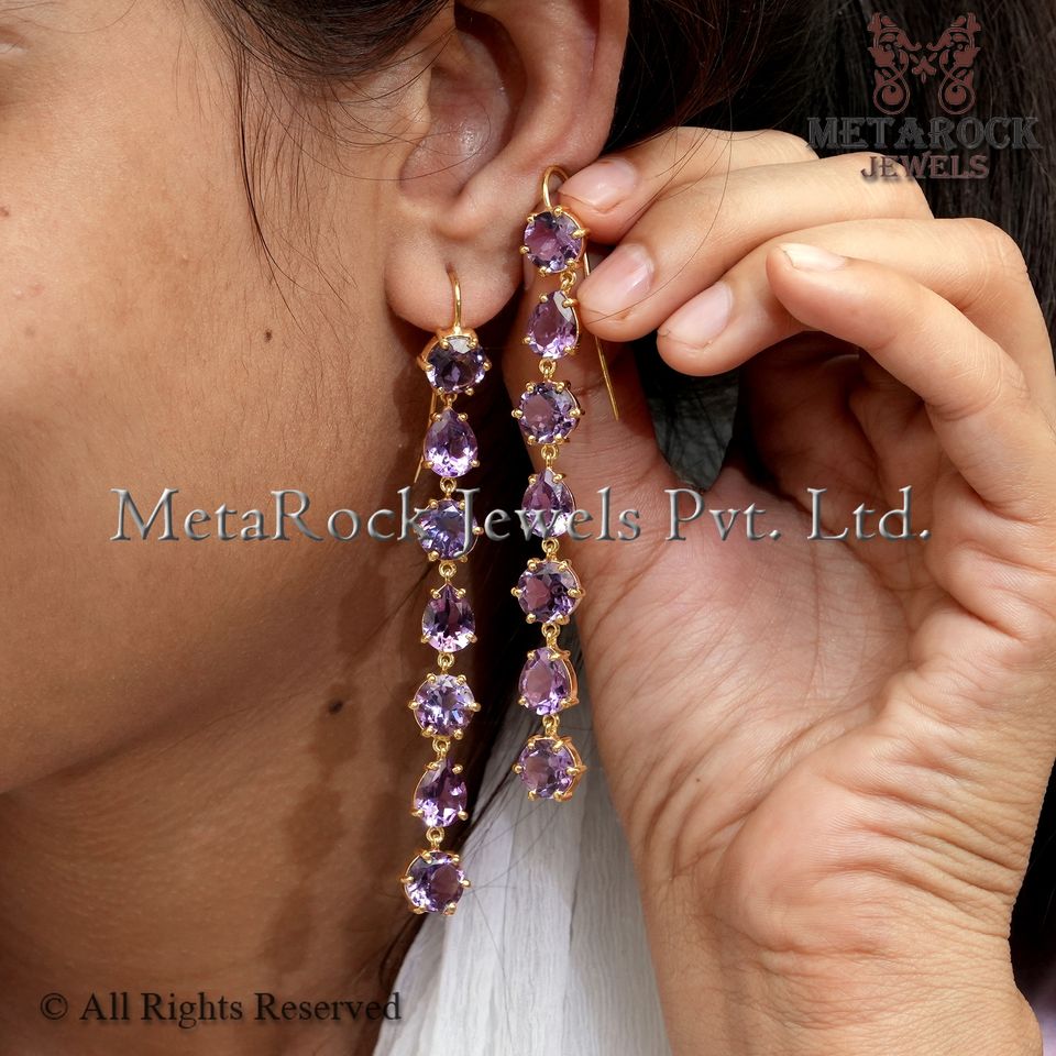 Solid 925 Silver Yellow Plated Amethyst Earings Gemstone Jewelry Wholesale Long Earrings New Design