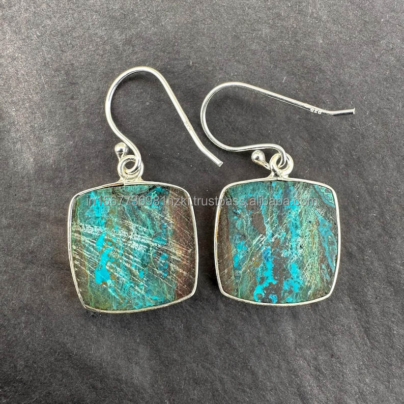 Solid 925 Sterling Silver Dangle Earrings, Natural Shattuckite Cushion Gemstone Handmade Jewelry, Gift For Her