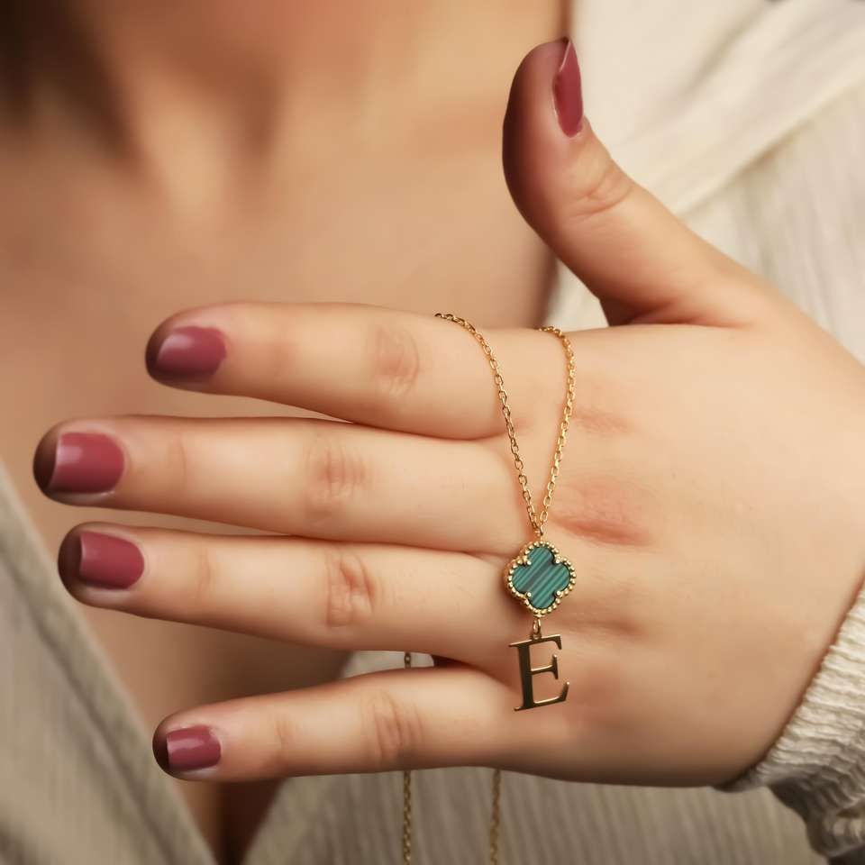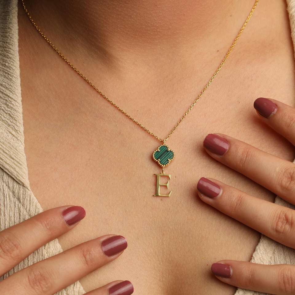 Solid 925 Sterling Silver Natural Malachite 14mm Clover Design E Alphabet Christian Minimalist Pendant Necklace Fine 18K Gold