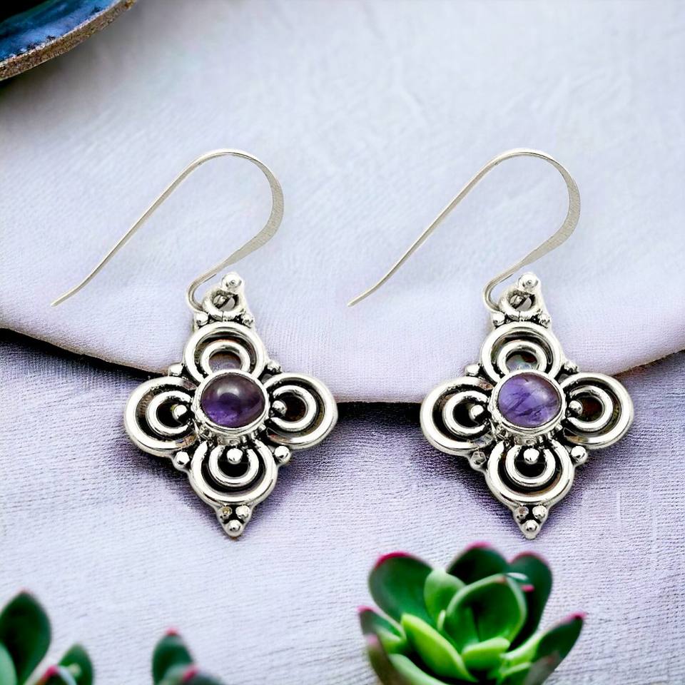 Solid 925 Sterling Silver Natural Purple Amethyst Gemstone Flower Shape Luxury Dangle Earring for Woman & Girls Handmade Jewelry