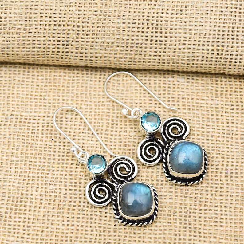 Solid 925 Sterling Silver Plated Bohemian Style Earrings Fashionable Labradorite Gemstone Natural Bezel Anniversary Supply