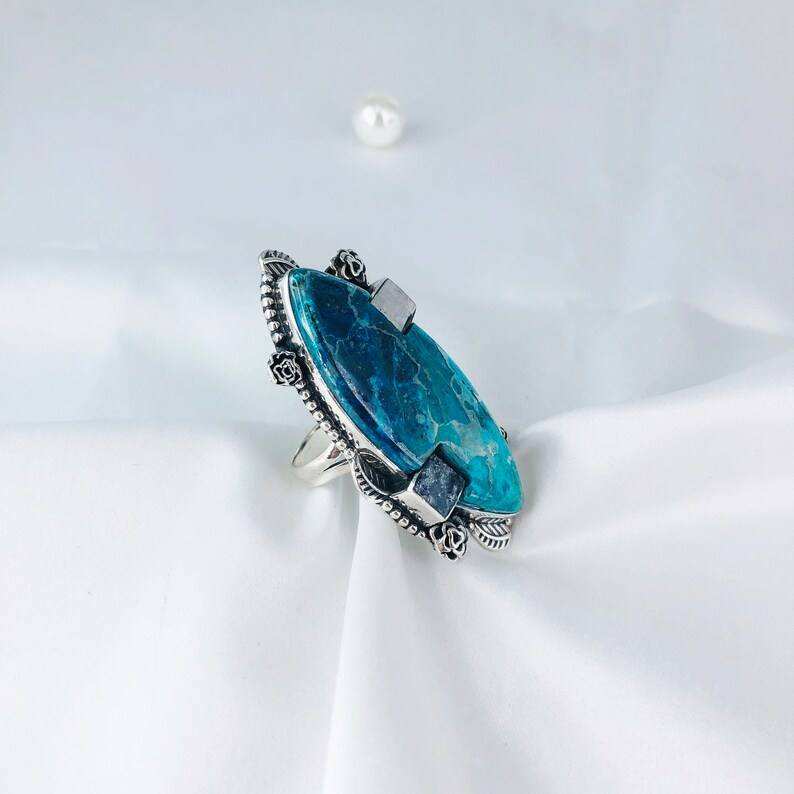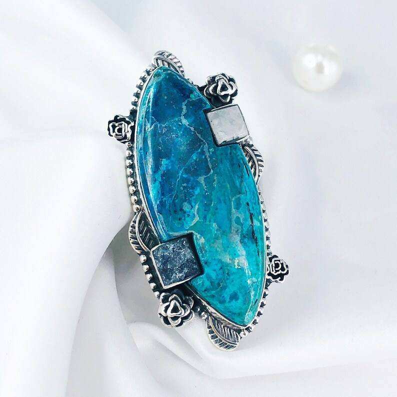 Solid 925 Sterling Silver Ring With Chrysocolla Apatite Moonstone Women Statement Gemstone Gift Ring