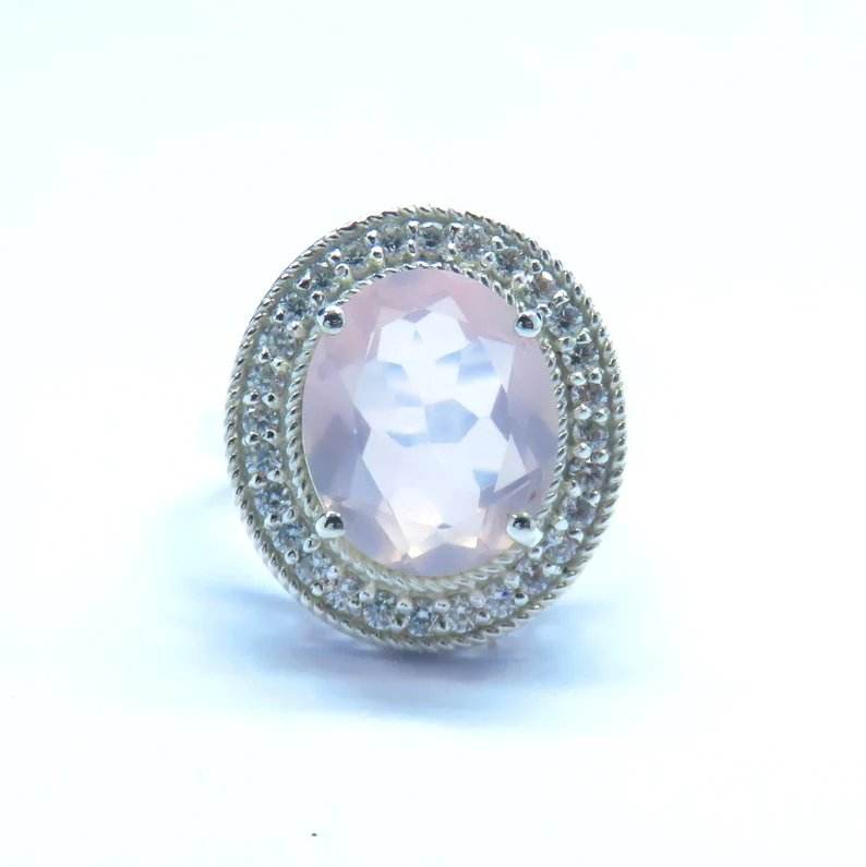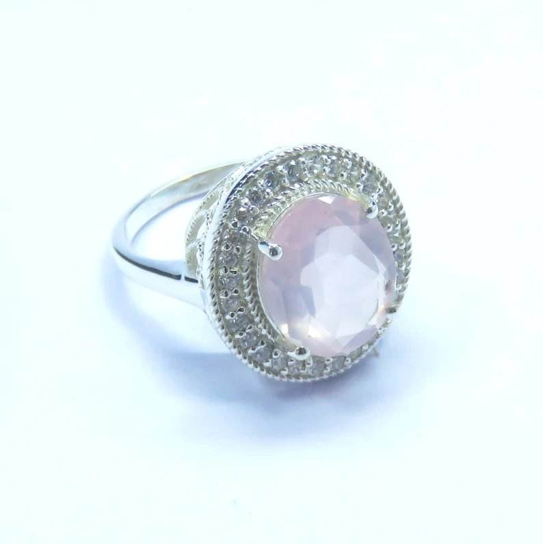 Solid 925 Sterling Silver Ring with Unique Rose Quartz Stone Design Trendy Classic Style for Wedding Engagement Party or Gift