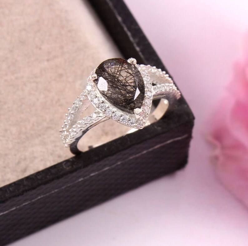 Solid 925 Sterling Silver Women's Wedding Engagement Band Pear Cut Black Rutile Diamond Classic Elegant Jewelry Rings for Girls