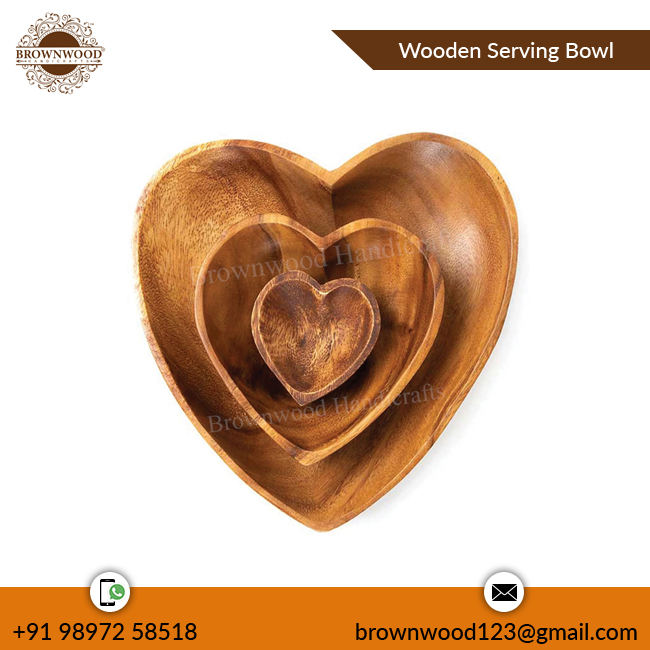 Solid Acacia Wood Heart Shape Serving Bowl Set of 3 Handmade Custom Free Logo for Restaurants & Hotels for Soup & Salad