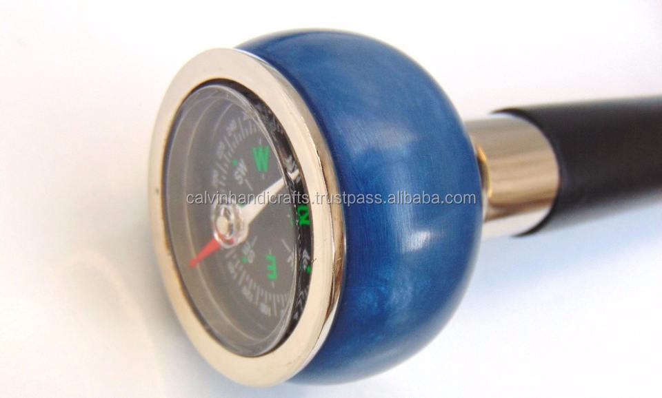 Solid Brass Antique Compass Walking Stick Beautiful Blue Color Walking Cane Made of Wood