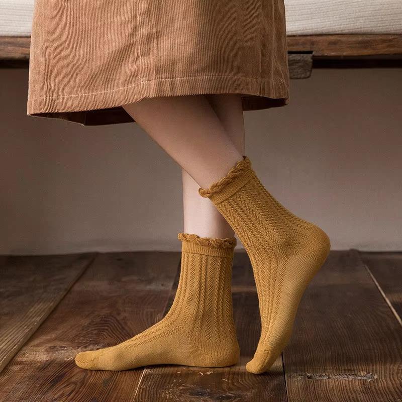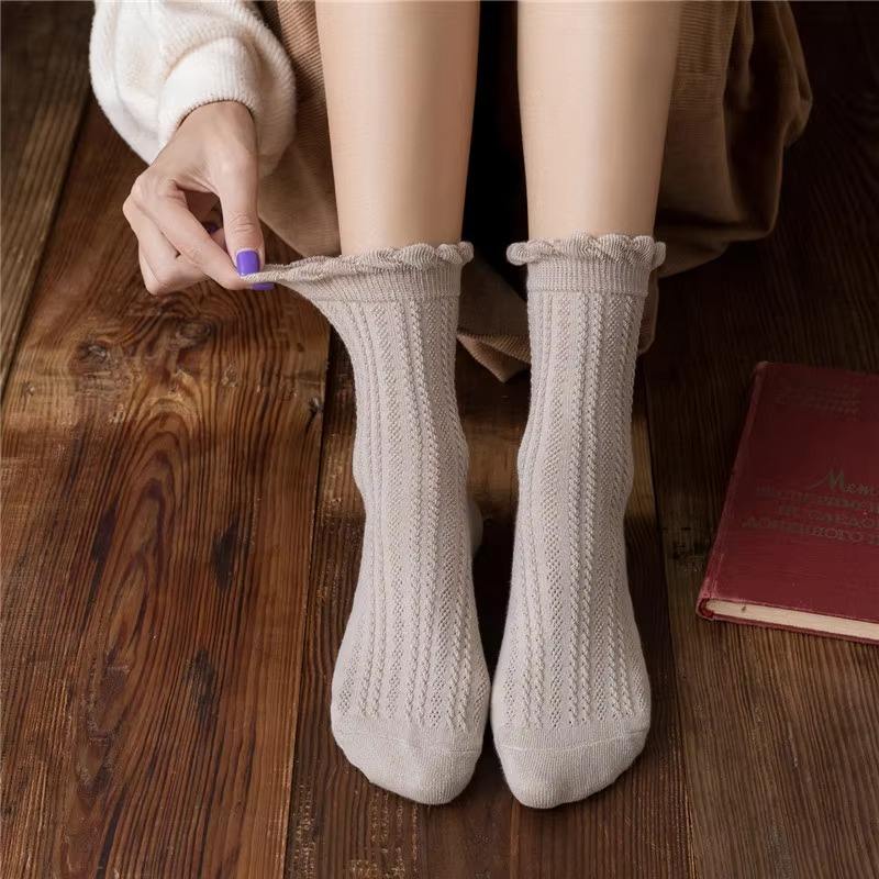 Solid Color Vertical Stripes Crew Socks Women Sweet Girl Cotton Soft